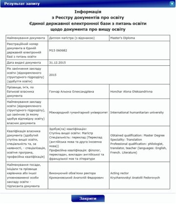 Журналистка Катерина Соляр перечислила факты, достоверно известные про Алену Алиеву: девушка закончила Международный Гуманитарный Институт в Одессе, получила красный диплом лингвиста, владеет французским и английским языками. Все это легко проверить в открытом реестре документов про образование. Замужество за Гейдаром Алиевым и двое детей – тоже общеизвестный факт.